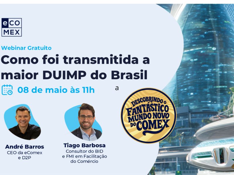 Brasília – Você já se perguntou como otimizar suas importações e reduzir processos fragmentados? A eComex apresenta, com entusiasmo, o webinar “Como foi transmitida a maior DUIMP do Brasil”. Neste encontro, que acontecerá em 08 de maio, às 11h, André Barros (CEO da eComex e da D2P) e Tiago Barbosa (consultor do BID e FMI) vão demonstrar, de forma prática, os bastidores do registro da maior Declaração Única de Importação do país. Clique aqui para se inscrever: http://linklist.bio/kjhgqqam9y.